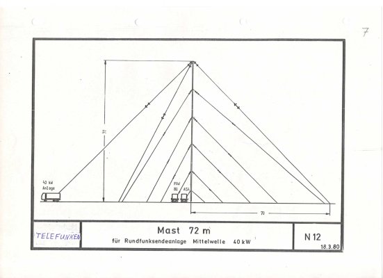 Die folgende Darstellung zeigt eine detaillierte Seitenansicht. Auf dieser wird neben den vom Mast isolierten Abspannungen auch die kapazitive Verlängerung (Dachkapazität) des strahlenden Sendemastes erkennbar: Zusätzliche Abspannungen, die mit der Mastspitze elektrisch leitend verbunden sind, verlängern den vertikalen Strahler. Ebenso gezeigt sind die einzelnen Ankerpunkte, die belastungsgerecht auch mit zwei oder vier Ankern und einem zugkraftverteilenden Joch ausgeführt wurden.