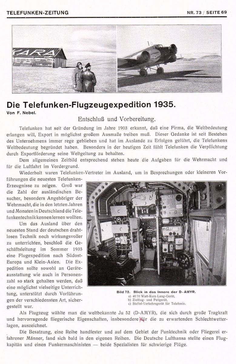 Im gleichen Heft wird eine Art „Roadshow“ von 1935 nach Südost-Europa und Kleinasien beschrieben. Die „Road“ war allerdings eine Ju 52 („Tante Ju“), vollgepackt mit Telefunkengeräten, die zu Werbezwecken vor Ort vorgeführt werden sollten. Der Zweck der offensichtlich äußerst erfolgreichen Aktion steht in der Einleitung: „Telefunken hat seit der Gründung im Jahre 1903 erkannt, daß eine Firma, die Weltbedeutung erlangen will, Export in möglichst großem Aufwand treiben muß … Besonders in der heutigen Zeit fühlt Telefunken die Verpflichtung durch Exportförderung seine Weltgeltung zu behalten. Dem allgemeinen Zeitbild entsprechend stehen heute die Aufgaben für die Wehrmacht und für die Luftfahrt im Vordergrund.“ Am 11.11.1935 ging es los und am 21.12. war man – nach einigen Abenteuern mit Vereisung, Landen auf dem falschen Flugplatz, dessen Piste auch noch einem „Sturzacker“ glich – wieder zurück in Berlin.